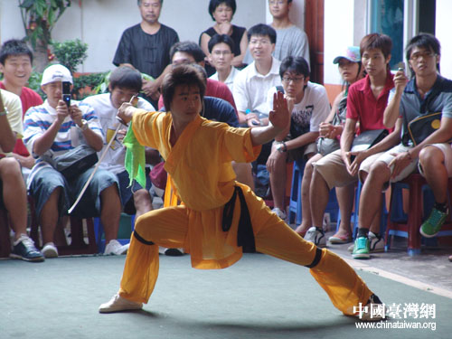 中國(guó)臺(tái)灣網(wǎng)8月10日福建莆田消息 首屆兩岸青年聯(lián)歡節(jié)“海峽西岸青年歡樂(lè)行”莆田參觀考察組因受到“寶霞”、“桑美”兩臺(tái)風(fēng)的影響,在上午取消了赴湄洲島參訪祭拜媽祖祖廟活動(dòng)。在莆田市接待工作組及臺(tái)灣十杰青年基金會(huì)的協(xié)調(diào)安排下,參觀南少林,觀看少林武術(shù)的表演成為昨天下午的新內(nèi)容。