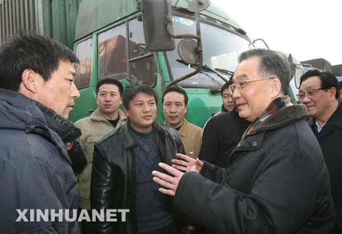 1月25日下午,中共中央政治局常委、國務院總理溫家寶來到京石高速公路河北涿州服務區和北京西站實地考察,并就做好春運工作,保障安全暢通作出部署。這是溫家寶總理在京石高速公路河北涿州服務區與貨車司機交談。 新華社記者姚大偉攝