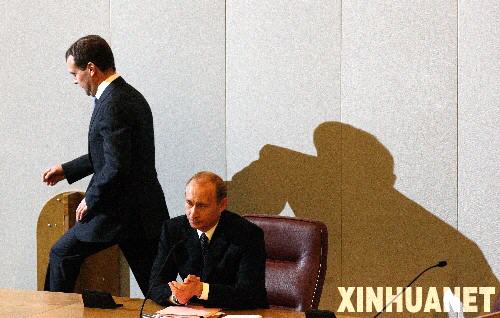 5月8日,在俄羅斯首都莫斯科,俄總統梅德韋杰夫(左)與前總統普京在國家杜馬(議會下院)出席非例行全體會議。當日,俄杜馬以392票贊成、56票反對和零票棄權的表決結果,批準了新總統梅德韋杰夫對普京出任新政府總理的提名。梅德韋杰夫已簽署命令,任命普京為俄新一屆政府總理。 新華社記者沈伯韓攝