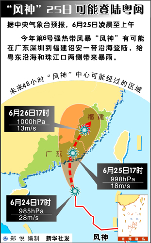 新華網廣州6月25日電(記者徐清揚)今年第6號強熱帶風暴“風神”25日早晨減弱為熱帶風暴,并于5時30分在深圳葵涌沿海地區登陸,登陸時中心附近最大風力9級,達到23米/秒(相當于83公里/小時)的風速,中心最低氣壓985百帕。