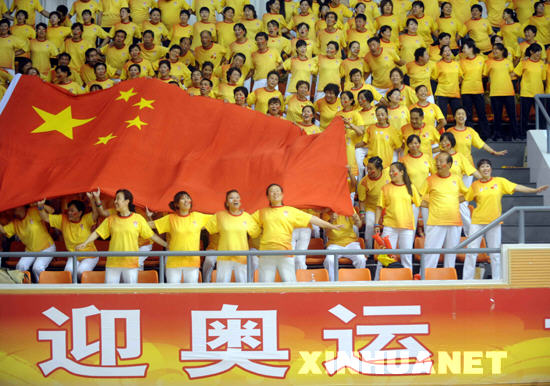 7月5日,拉拉隊在看臺上吶喊助威。當日,“微笑北京、志愿奧運、共創(chuàng)和諧——北京奧運會、殘奧會拉拉隊大賽”在北京門頭溝體育館舉行。新華社記者羅曉光攝