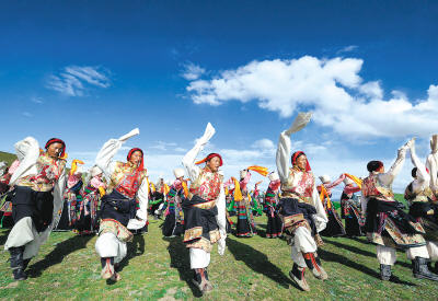 萬名藏北牧民在那曲草原上快樂地跳起鍋莊舞慶奧運(yùn)。圖片來源:新華社