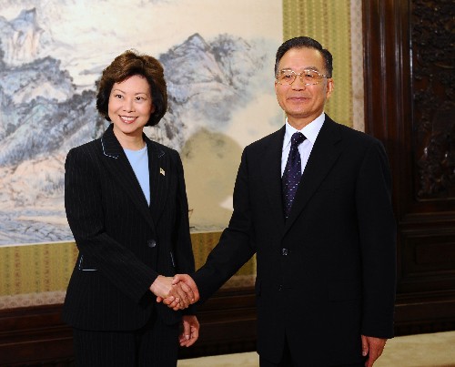 8月23日,中國國務(wù)院總理溫家寶在中南海紫光閣會見前來出席北京奧運(yùn)會閉幕式及相關(guān)活動的美國總統(tǒng)代表團(tuán)團(tuán)長、勞工部長趙小蘭。新華社記者 李濤 攝