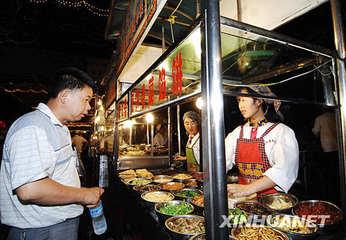 7月25日,一名顧客在夜市購(gòu)買(mǎi)小吃。烏魯木齊最大的夜市——“五一星光夜市”于7月21日晚重新開(kāi)市。夜市里有維吾爾族的烤全羊、羊肉串、手抓飯、薄皮包子,回族的黃面、粉湯、油香,哈薩克族的奶茶、油果子,還有內(nèi)地的刀削面、湯圓、米線(xiàn)、米粉、水餃等。游客在一陣陣吆喝聲中享受各種美味,場(chǎng)面熱鬧。新華社記者章磊攝