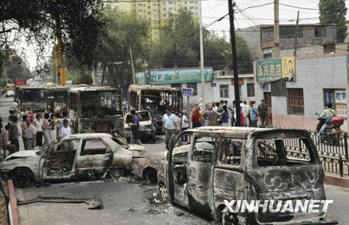 7月6日,烏魯木齊市北灣街上停放著多輛被燒毀汽車(chē)。新華社記者 沈橋攝