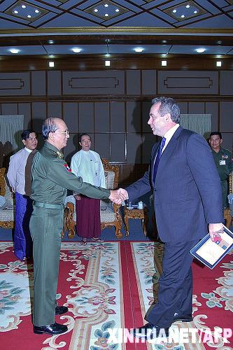 這張11月4日緬通社發(fā)布的照片顯示,美國主管東亞和太平洋地區(qū)事務(wù)的助理國務(wù)卿庫爾特坎貝爾(右)在緬甸新首都內(nèi)比都會見緬甸政府總理登盛上將。坎貝爾4日晚在結(jié)束訪問緬甸前說,美國正準(zhǔn)備采取步驟改善美緬關(guān)系。這是14年來美國高官首次訪問緬甸。新華社/法新