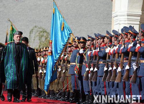 11月19日,在阿富汗首都喀布爾的阿總統府,阿富汗總統卡爾扎伊(左)在宣誓就職前檢閱儀仗隊。當天,卡爾扎伊宣誓就職,開始其第二個5年的總統任期。新華社記者扎比攝