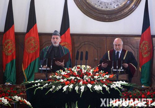 最終,卡爾扎伊在兩名副總統穆罕默德·法希姆和穆罕默德·卡里姆·哈利利陪同下宣誓就職。