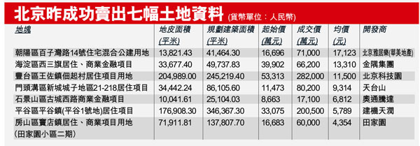 中新網12月31日電 北京30日拍賣七塊土地,香港《文匯報》報道稱,這可能是內地2009年最后一次土地拍賣。雖然中央近日一再出招抑樓市,但這場拍賣面積小、好地段少、起步價低的拍賣會,仍延續近來房地產狂熱,七塊土地成交額達77.7億元人民幣(下同)。