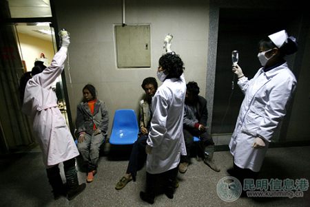 “讓開,先讓傷員進(jìn)去!”昨天下午4點(diǎn)左右,昆明市經(jīng)開人民醫(yī)院的所有醫(yī)護(hù)人員都動(dòng)員起來,為傷者辟出一條“生命通道”。從工地上送來的工人不斷增多,共有22名。其中包括7名女性和15名男性。其中8名骨折的傷員病情較重,需要第一時(shí)間做檢查,并以最快速度安排手術(shù)。