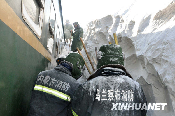 1月4日,消防戰士在內蒙古商都受暴雪圍困的旅客列車邊除雪搶險。新華社發(田瑜 攝)