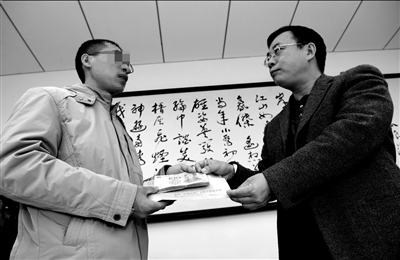小張(左)從全國“掃黃打非”辦公室負責人黃曉新手中接過獎金。記者蒲東峰攝