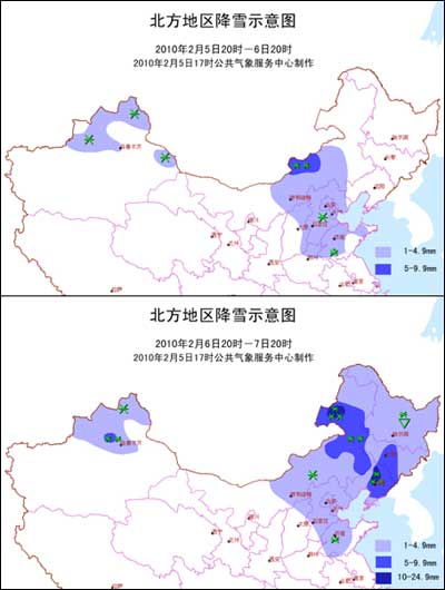 2010年2月5日20時(shí)-7日20時(shí)北方地區(qū)降雪示意圖