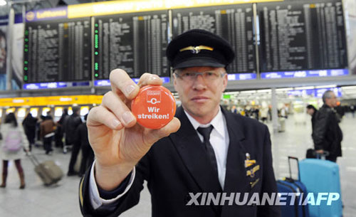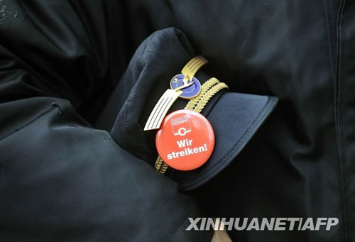 2月22日,一名漢莎航空公司的飛行員夾著自己的帽子,上面別有“我們正在罷工”的徽章。新華社/法新