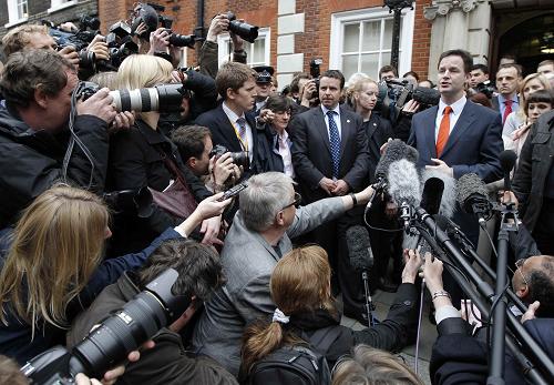 5月7日,英國自由民主黨領(lǐng)導(dǎo)人克萊格在英國倫敦向記者講話。英國大選計票工作當(dāng)日下午結(jié)束,沒有一個政黨在議會贏得半數(shù)以上議席,從而形成自1974年以來第一個“無多數(shù)議會”。但保守黨議席數(shù)大大超過工黨,成為議會第一大黨。新華社/路透