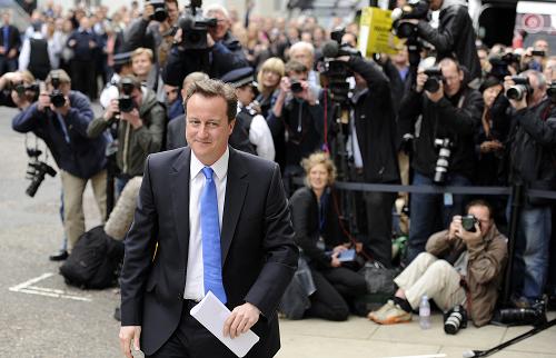 5月7日,英國保守黨領(lǐng)袖卡梅倫抵達(dá)英國倫敦一個俱樂部準(zhǔn)備發(fā)表聲明。英國大選計票工作當(dāng)日下午結(jié)束,沒有一個政黨在議會贏得半數(shù)以上議席,從而形成自1974年以來第一個“無多數(shù)議會”。但保守黨議席數(shù)大大超過工黨,成為議會第一大黨。新華社/路透