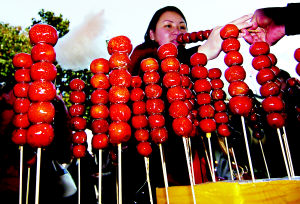走進影視基地,只見青石板鋪就的路上大紅燈籠高高掛起,主大街的兩旁擺滿了各色各樣的攤位,出售各種臺灣美食和工藝品,十足的寶島風情。這邊,在電視劇《轉角遇到愛》中名聲大振的臺灣特色小吃蚵仔煎在廚師的手中正散發出陣陣香味,讓不少人垂涎欲滴,駐足購買;那邊,臺灣正宗脆皮臭豆腐成為了不少老人的最愛,在一旁的游客休息區里,幾個老太太正手拿幾串炸得金黃酥脆的臭豆腐大快朵頤;再遠一點,彩色的棉花糖、晶瑩剔透的糖葫蘆,以及各種動物造型的麥芽糖都是孩子們的寵兒,買上一個比自己腦袋還大的棉花糖邊吃邊看,真是甜在心頭。