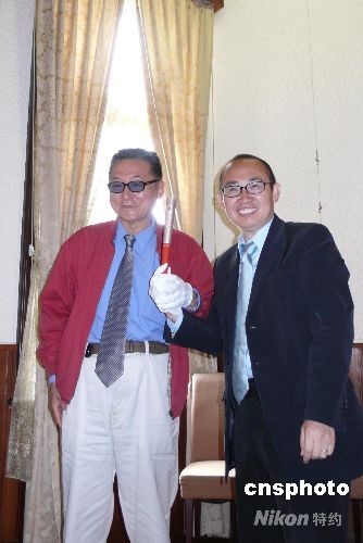 臺(tái)灣知名學(xué)者李敖與大陸知名地產(chǎn)商潘石屹十八日在臺(tái)北舉行對(duì)談活動(dòng),吸引媒體采訪。圖為對(duì)談結(jié)束后,潘石屹贈(zèng)送李敖北京奧運(yùn)祥云火炬紀(jì)念品。 中新社發(fā) 曾嘉 攝