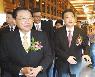 臺灣海基會董事長江丙坤(前左)昨天出席第十二屆京臺科技論壇開幕式。來源:臺灣《聯(lián)合報》
