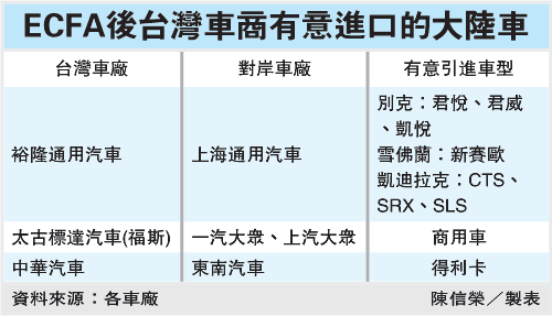中國臺灣網11月5日消息 兩岸經濟合作架構協議(ECFA)簽署在即,未來大陸整車出口到臺灣可享零關稅優惠。臺灣裕隆通用汽車昨日率先宣布,只要法令一開放,將進口上海通用汽車到臺販賣。臺灣福斯汽車總代理太古汽車集團及中華汽車高層也透露,正研擬自大陸合作車廠,引進部分商用車來臺販賣。