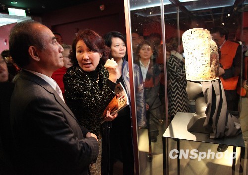 2月6日,“黃金旺族——內蒙古博物院大遼文物展”在臺北故宮博物院正式對公眾開放。此次展出的115組以契丹黃金文物為主的稀世珍寶中有57件是大陸一級文物。這是臺灣歷年來舉辦大陸文物展頂級珍寶數量最多的一次。圖為臺灣“立法院”院長王金平(左一)觀看展出的陳國公主墓出土的珍貴文物“公主銀鎏金高翅冠”。 中新社發 耿軍 攝