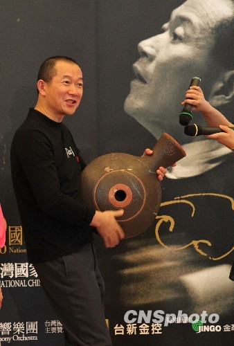 國際知名作曲家、指揮譚盾3月26日將在臺北首演他創造的曲目《垚樂:大地之聲》。演奏中將首次使用以大陸、香港和臺灣三地陶土制成的樂器。圖為3月22日,譚盾在臺北音樂廳舉辦的發表會上,介紹最新制作的,以大陸、香港和臺灣三地陶土燒制而成的陶質打擊樂器。 中新社發 耿軍 攝