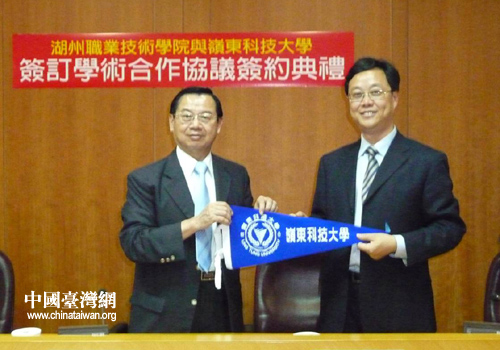 中國臺灣網7月2日湖州消息 日前,臺灣嶺東科技大學校長陳振貴與湖州職業技術學院院長胡世明簽訂合作協議,兩校正式結為姊妹學校。湖州職業技術學院的22名女生應陳校長的邀請,將于2010年9月13日至2011年1月14日期間赴臺灣進行交流學習。期間,將在臺灣嶺東科技大學選修18-20學分的課程進行學習。