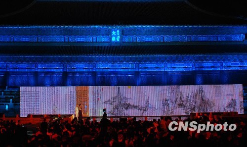 5月15日晚,珍藏在海峽兩岸博物館的《富春山居圖》在北京太廟通過屏幕實現“合璧”。中央文史研究館館長袁行霈為活動致辭,并與館員歐陽中石、程毅中、沈鵬、傅熹年、侯德昌、舒乙一起為高仿真的《富春山居圖》題跋。 中新社發 楊慧峰 攝