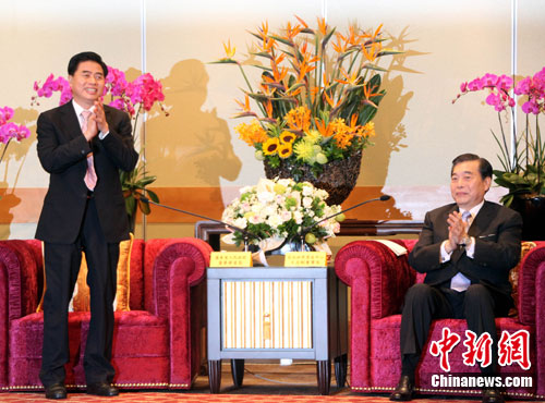 8月16日,廣東省省長黃華華(左)率團(tuán)到臺(tái)北參加“臺(tái)灣·廣東周”活動(dòng)。他在與臺(tái)北世貿(mào)中心董事長王志剛(右)及臺(tái)灣工商企業(yè)界人士會(huì)面時(shí)強(qiáng)調(diào),廣東的發(fā)展與臺(tái)灣同胞的大力支持分不開。中新社發(fā) 劉舒凌 攝