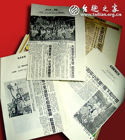 至于小天使參觀臺(tái)北故宮、參觀張大千的“摩耶精舍”、參觀臺(tái)中科技博物館,游覽嘉義阿里山、游覽臺(tái)北木柵動(dòng)物園,施放和平鴿、種植和平樹(shù),在香港見(jiàn)到聶衛(wèi)平,在臺(tái)北崇光百貨見(jiàn)到“小虎隊(duì)”等等等等,無(wú)一不成了媒體關(guān)注的熱點(diǎn)。小天使所到之處,媒體記者如影隨形,事無(wú)巨細(xì),都上了媒體版面。