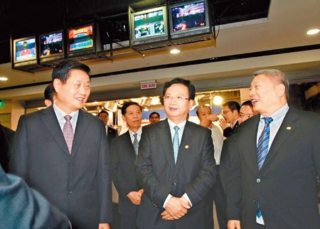 陜西省代省長趙正永(左)、副省長景俊海(中)一行人15日在臺灣旺旺中時媒體集團董事長蔡衍明(右)等人陪同下參觀中天電視!碓矗号_灣《中國時報》
