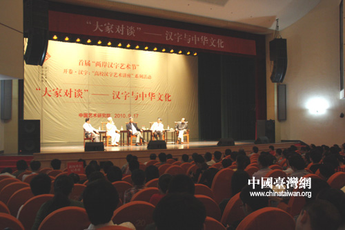 中國臺灣網9月17日北京消息 今天上午,一場主題為“大家對談——漢字與中華文化”的講座在中國藝術研究院舉行,作為首屆兩岸漢字藝術節的一部分,“開卷·漢字:高校漢字藝術講座”系列活動就此拉開帷幕。4位來自兩岸的“大家”——許嘉璐、林谷芳、田青、黃光男齊聚一堂,或侃侃而談,或偶有爭論,或與觀眾親切互動,觀點激蕩中、言談舉止間,無不流露出對“方塊字”的贊美、對自己民族文字的自豪。
