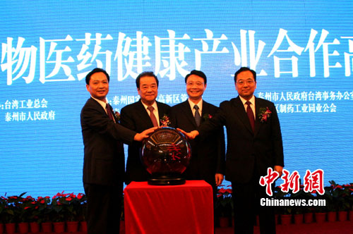 當日,江蘇省副省長何權、中共泰州市委書記張雷、泰州市代市長徐郭平以及臺灣工業總會理事長陳武雄共同為由臺灣工業總會和泰州醫藥高新區共同負責開發建設而設立的“海峽兩岸(泰州)生技產業園”揭牌。海峽兩岸生物醫藥健康領域的400多名精英出席并共同見證。