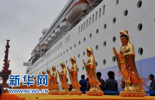隨著一聲汽笛長鳴,載有1000尊南海觀音佛像的郵輪于27日下午駛離舟山老塘山碼頭,開往臺(tái)灣為民眾祈福。