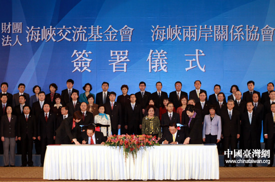 海協會會長陳云林和;鶗麻L江丙坤正式簽署《海峽兩岸醫藥衛生合作協議》。(中國臺灣網 鐘寶華 攝)
