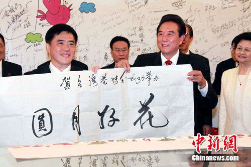 在臺北花博營運總部,臺北市長郝龍斌向陳云林致贈瓷兔,陳云林則回贈自己的書法“花好月圓”。作者:黃少華