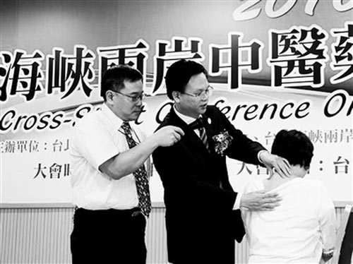 近日,由廣西醫師協會、廣西中醫藥學會、臺北中醫師公會、臺灣海峽兩岸醫藥合作協會共同舉辦的2010年海峽兩岸中醫藥學術大會在臺大醫院舉行。這是與會專家現場演示按摩醫治手法。 劉 巖攝