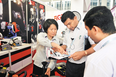 4月16日,一家生產專業電動工具的臺企參展商(左)在第109屆廣交會上向采購商介紹產品。 新華社記者 陳曄華 攝
