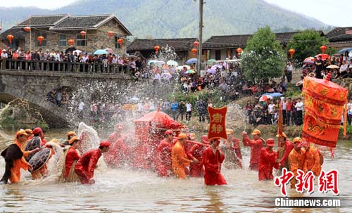 在小溪中,十多位村民裝扮成蝦兵蟹將、水怪的模樣在前頭攔路,并且不斷地用水潑轎子。抬轎的青壯年則左沖右突,沖破重重障礙,直奔天 后宮,演繹著媽祖不畏風大浪高救難救世的功績。整個過海儀式三進三出,古樸、熱鬧。作 者:劉文福
