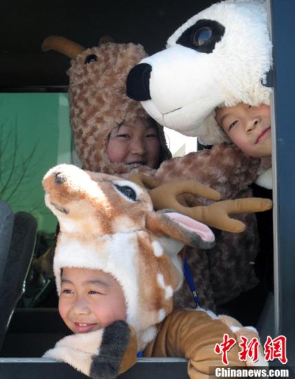 資料圖:4月16日上午,威海小朋友來到當地機場迎候臺灣梅花鹿和長鬃山羊,她們將穿著羊與鹿以及大熊貓樣式的服裝表演舞蹈。這三種珍貴的動物起將一同生活在劉公島國家森林公園。劉舒凌 攝
