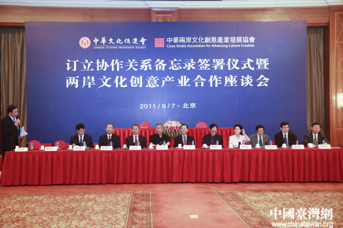 中國臺灣網(wǎng)9月7日北京消息 今日,中華文化促進會(以下簡稱“文促會”)與來自臺灣的中華兩岸文化創(chuàng)意發(fā)展協(xié)會(以下簡稱“文創(chuàng)會”)在京舉行了訂立協(xié)作關系備忘錄簽署儀式,并就兩岸文化創(chuàng)意產(chǎn)業(yè)合作展開座談。
