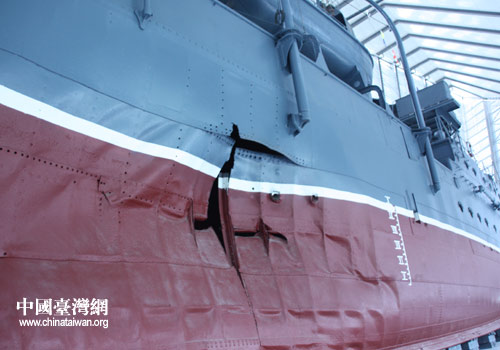當年激戰中,日機投下的炮彈落在江中,激起幾丈高的水柱,船身鋼板連接處被巨大的波浪撕開一個口子。(中國臺灣網 李丹 攝)