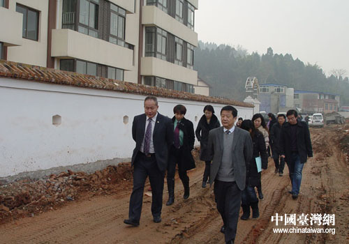 德陽(yáng)市臺(tái)辦主任獨(dú)遠(yuǎn)程(前右1)陪同林郁華協(xié)理(前左1)等來(lái)賓參觀即將竣工的新福利院。(德陽(yáng)市臺(tái)辦 甘和林 攝)