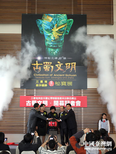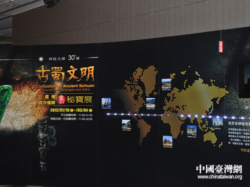 臺北是“神秘北緯30度線——三星堆、金沙古蜀文明秘寶展”的第一站,展至3月4日,此后還將到臺中、高雄巡回展出,于2012年6月10日結(jié)束。據(jù)介紹,展覽門票已經(jīng)有近5萬人次預(yù)訂,主辦方預(yù)計,整個展覽將吸引40萬以上臺灣民眾參觀展覽。