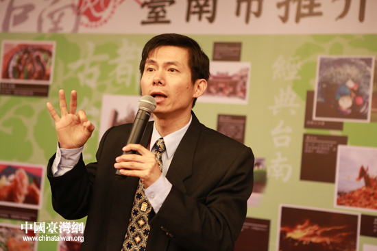 16日,第四屆海峽論壇舉行臺(tái)灣縣市推介會(huì)。圖為臺(tái)南市觀光旅游局副局長(zhǎng)林國華介紹臺(tái)南風(fēng)情。(中國臺(tái)灣網(wǎng) 王偉 攝)