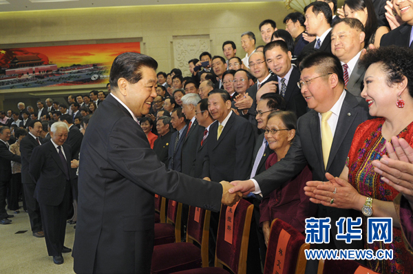 6月19日,中共中央政治局常委、全國政協(xié)主席、中國和平統(tǒng)一促進會會長賈慶林在北京會見出席中國和平統(tǒng)一促進會八屆二次理事大會的全體代表。新華社記者 饒愛民 攝