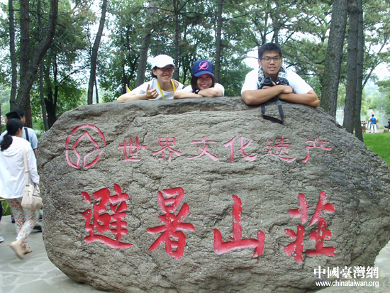 臺(tái)胞青年千人夏令營(yíng)成員在承德避暑山莊石碑前合影。(中國(guó)臺(tái)灣網(wǎng) 王新妍 攝)