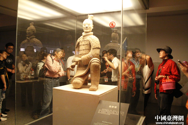 臺(tái)灣經(jīng)貿(mào)代表團(tuán)嘉賓正在觀賞“跪射俑”。(中國(guó)臺(tái)灣網(wǎng) 芮益芳 攝)