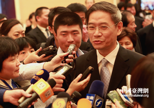 中共中央臺辦、國務院臺辦主任張志軍今日在第十一屆兩岸關系研討會開幕式后接受兩岸記者聯(lián)合采訪。(中國臺灣網(wǎng) 高斯斯 攝)