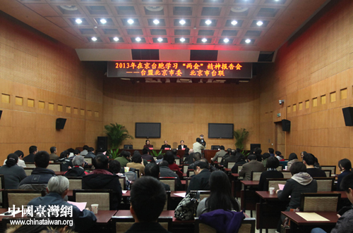2013年在京臺胞學習全國和北京市“兩會”精神報告會于3月23日舉行,臺盟中央副主席、北京市臺聯會長蘇輝、全國臺聯副會長紀斌等出席。(北京市臺聯供圖 裴芝榮 攝)